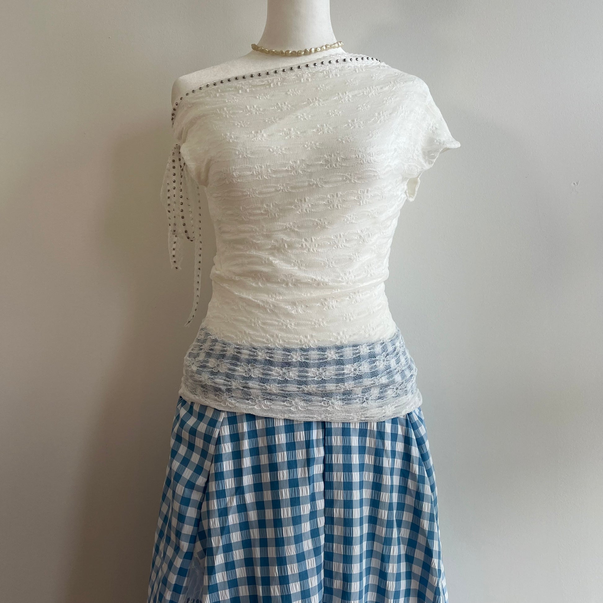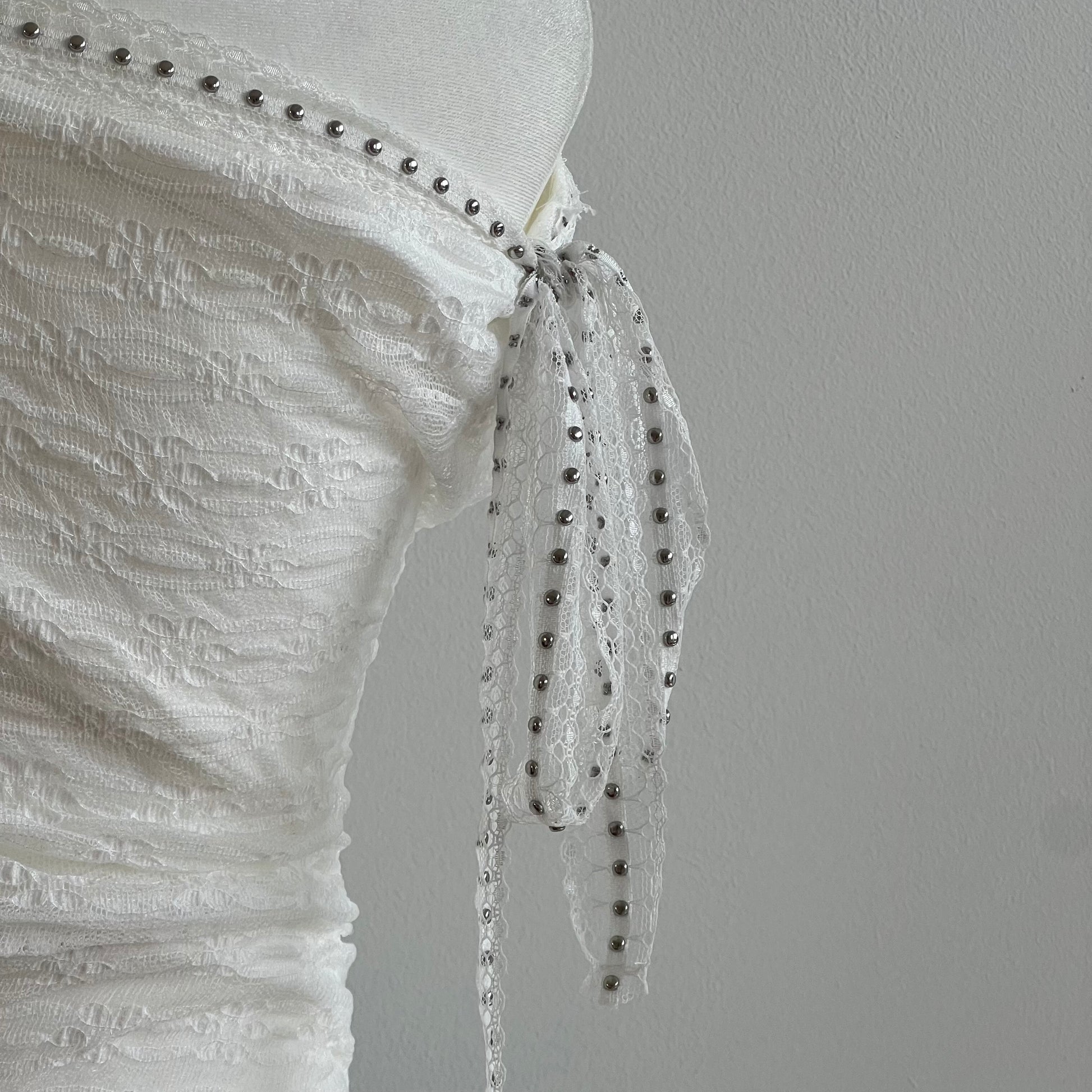 Evelyn White Off-Shoulder Top — a delicate lace piece with tie-up detailing and a romantic off-shoulder cut. Style with a ruffled skirt or wide-leg trousers for an effortless chic look.