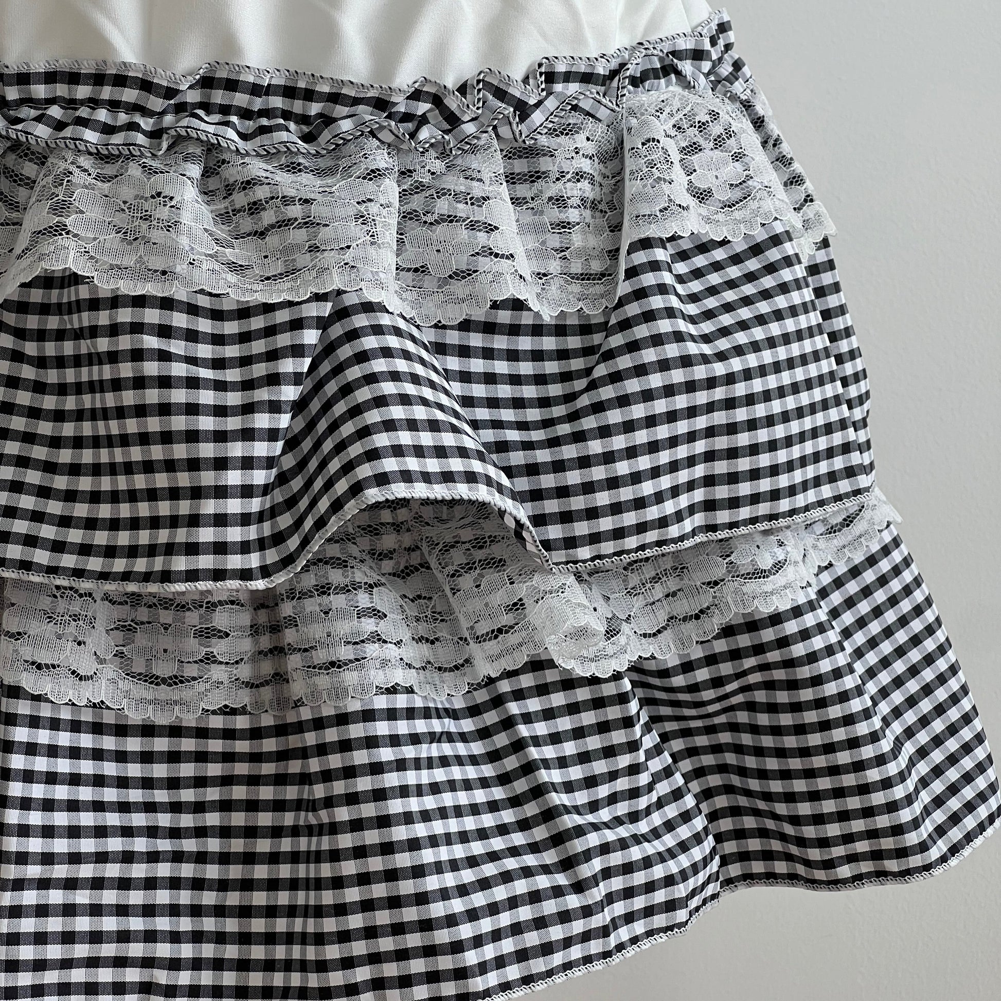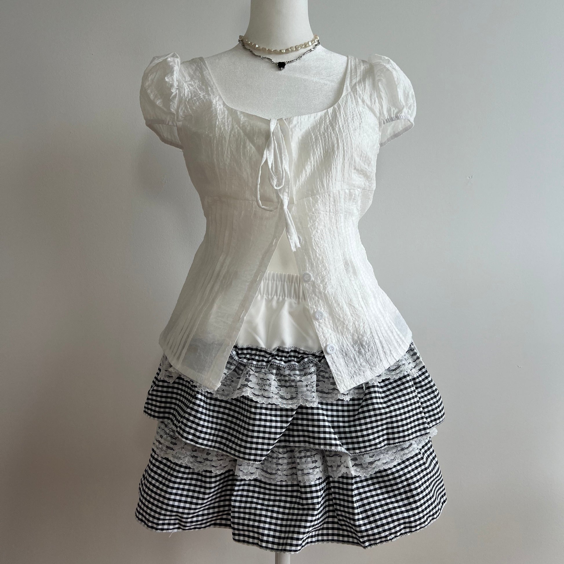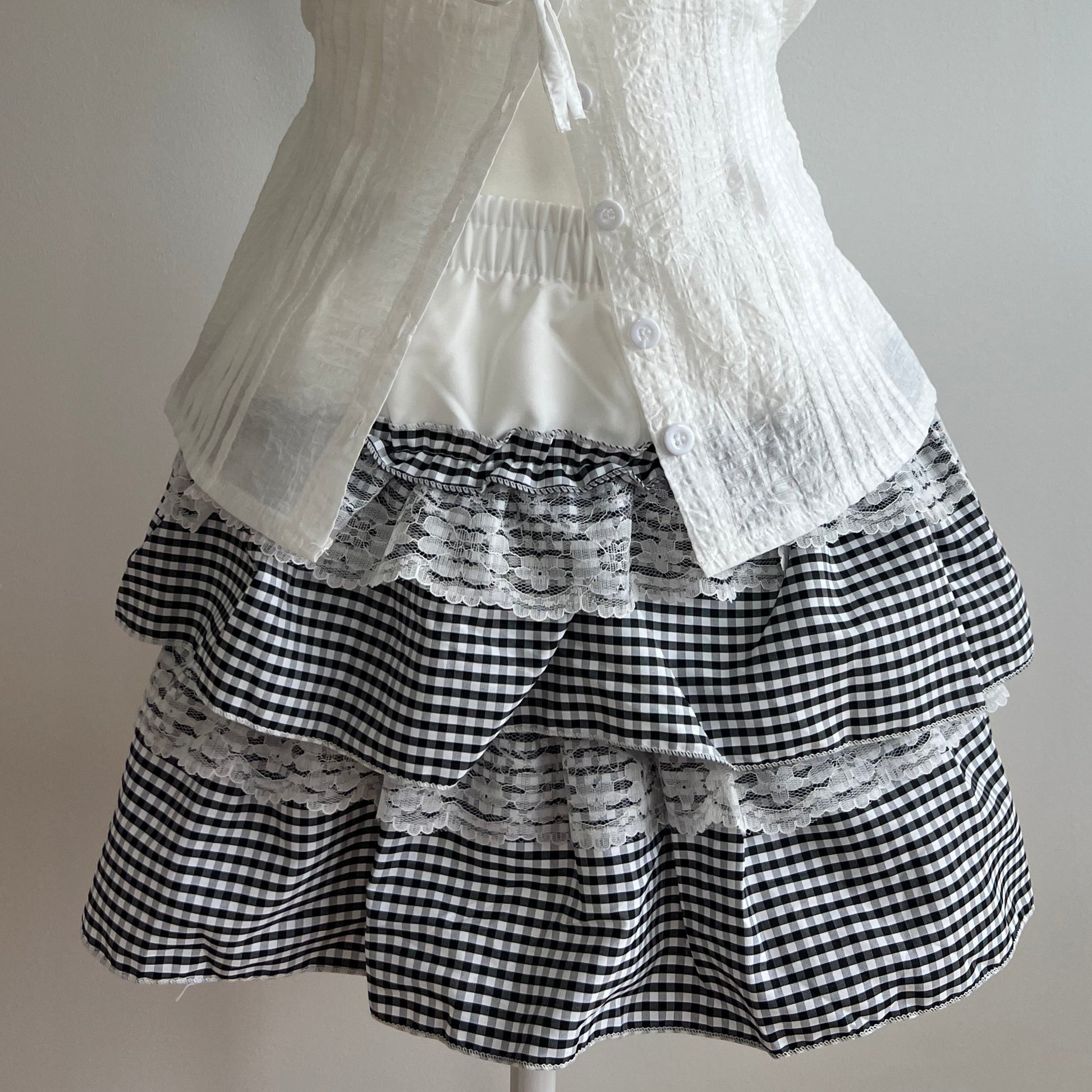 Handkerchief White Gingham Skirt, a mini skirt in soft white gingham with crisp white lace trim and gentle black and white ruffle detailing. Designed with a flattering silhouette and subtle volume, it brings together nostalgic charm and modern styling. Pair it with simple tanks or structured tops for a balanced, feminine look.
