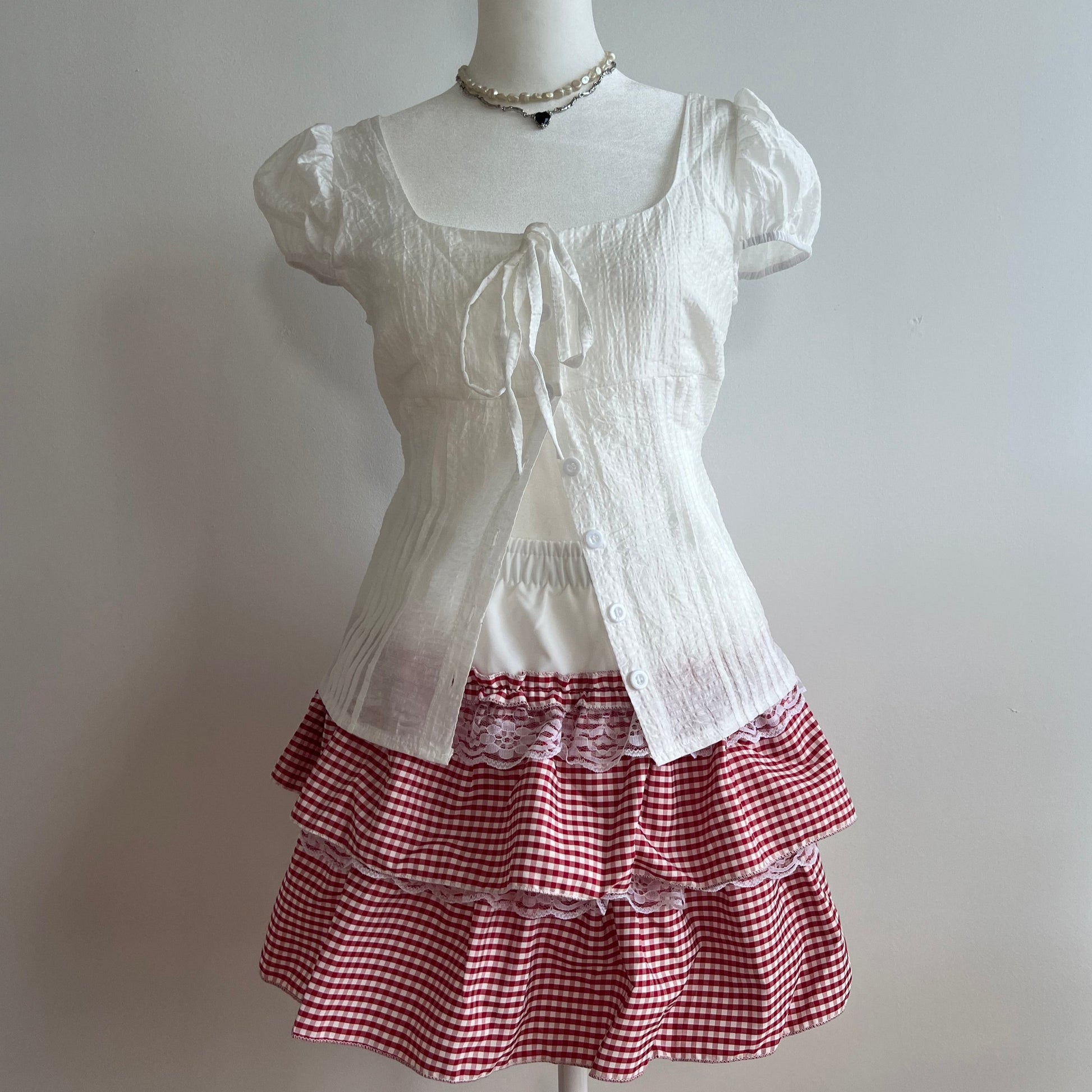 Handkerchief Red Gingham Skirt, a mini skirt in classic red gingham with crisp white lace trim and soft ruffle detailing. Designed with a flattering silhouette and subtle volume, it brings together nostalgic charm and modern styling. Pair it with simple tanks or structured tops for a balanced, feminine look.