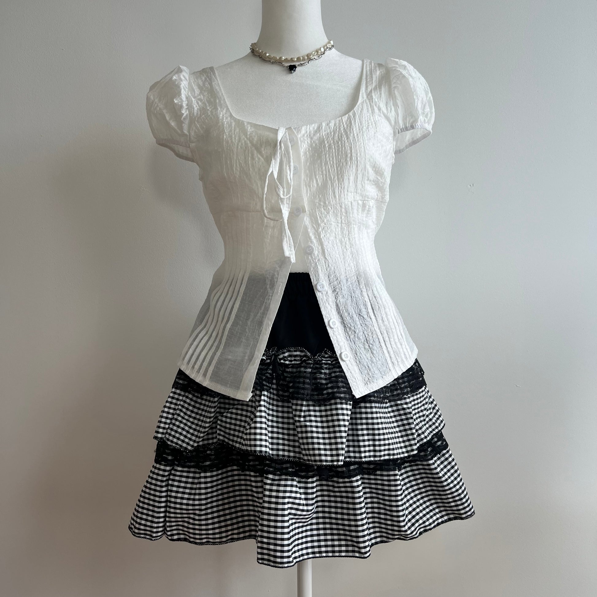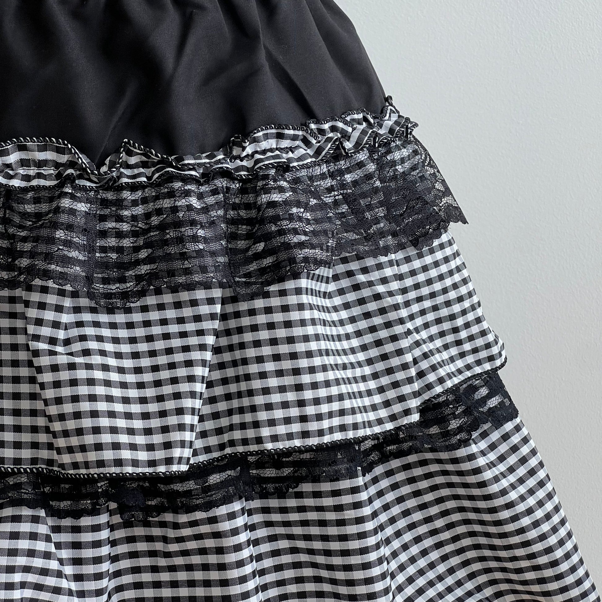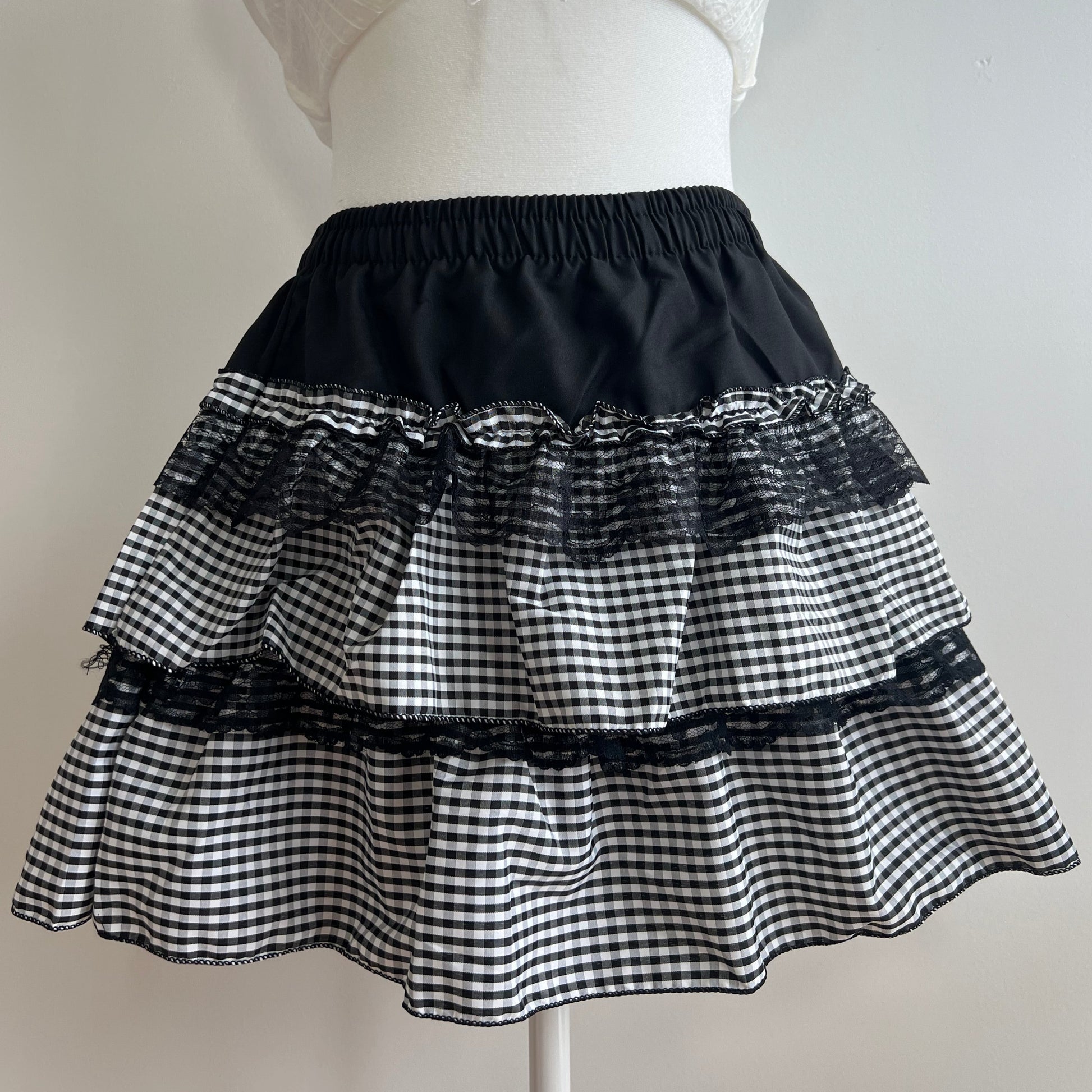 Handkerchief Black Gingham Skirt, a mini skirt in deep black gingham with crisp white lace trim and soft ruffle detailing. Designed with a flattering silhouette and subtle volume, it captures a moody romantic charm with feminine flair. Pair it with delicate tops or fitted knits for a sweet yet striking look.