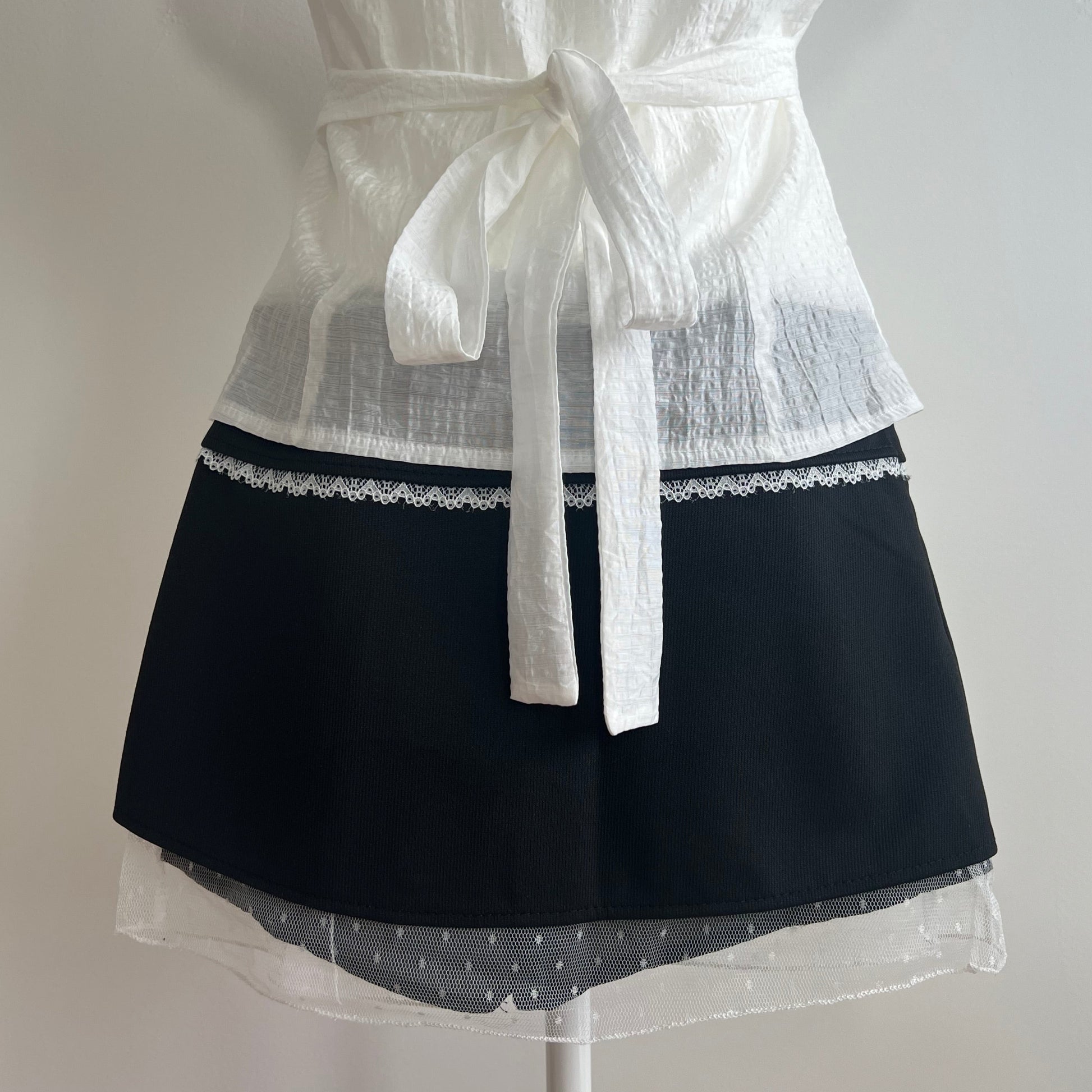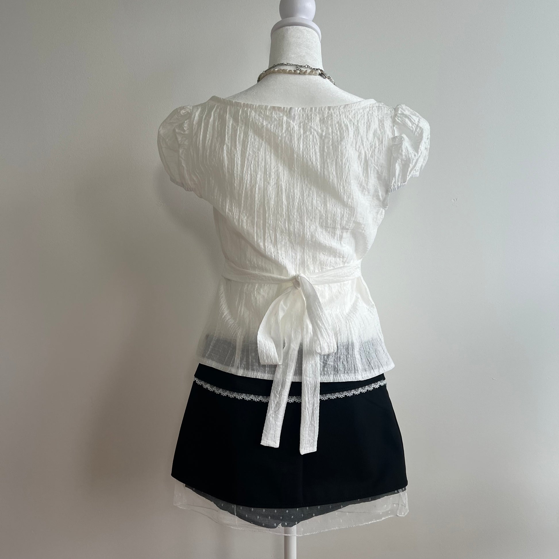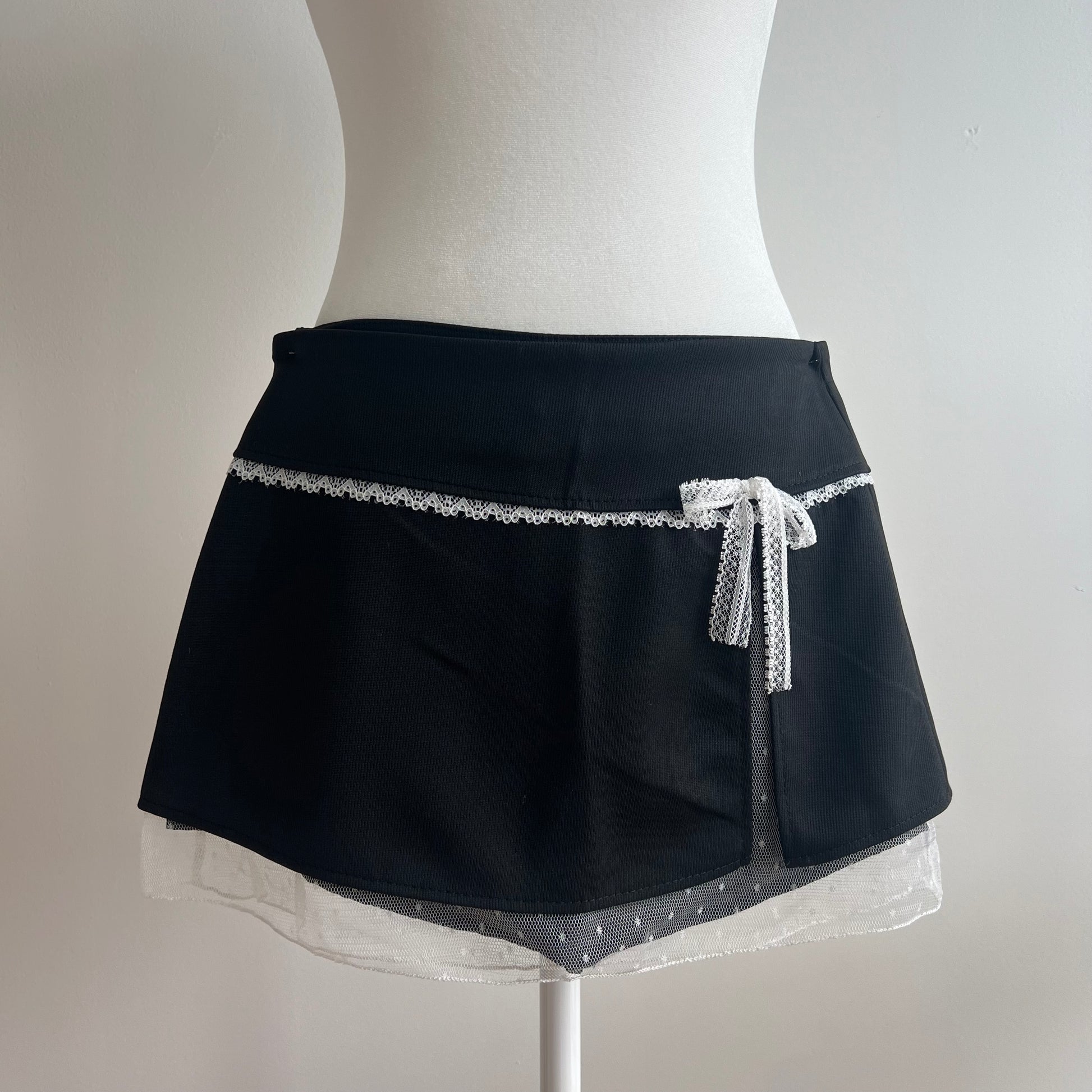 Lisa Black Lace Skirt — a soft ribbed mini skirt in classic black, accented with delicate white lace trim and a sheer ribbon bow for a subtle contrast and romantic touch. Featuring a flattering low-rise fit and a gentle side slit, it’s the perfect blend of flirty and effortless.
