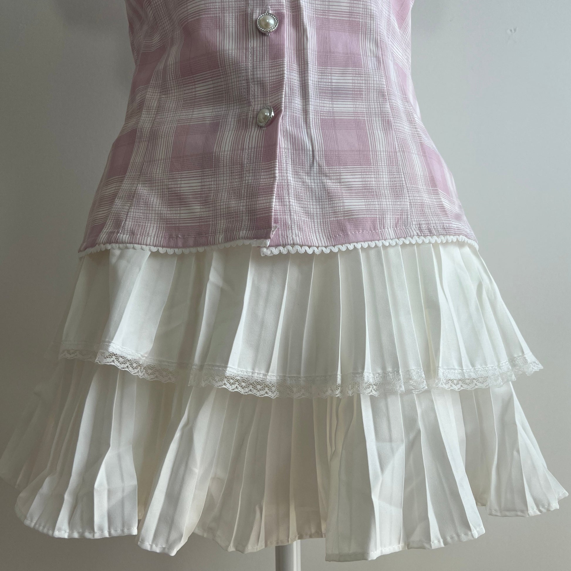 Melanie White Tennis Skirt — a crisp white mini skirt with soft ruffle edges and a delicate bow detail at the waist. Inspired by classic tennis silhouettes, it’s reimagined with a hyper-feminine twist for everyday charm. Style it with fitted cardigans or cropped blouses for a clean, romantic look.