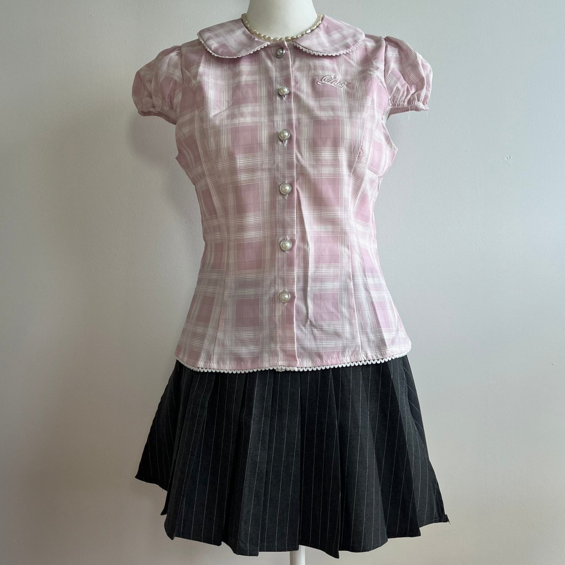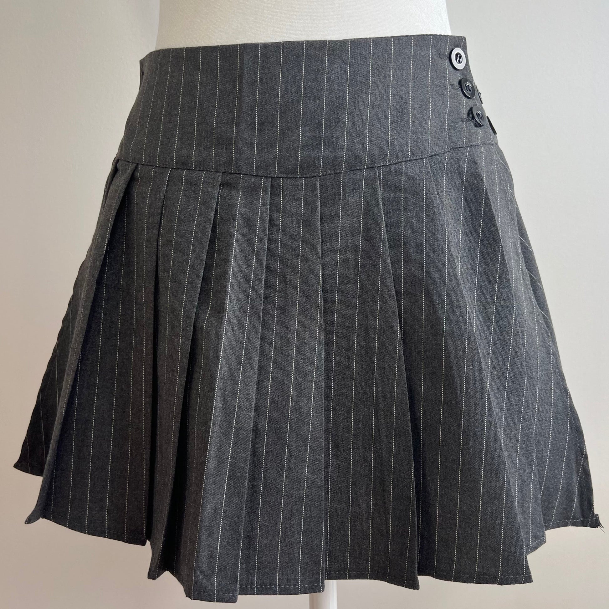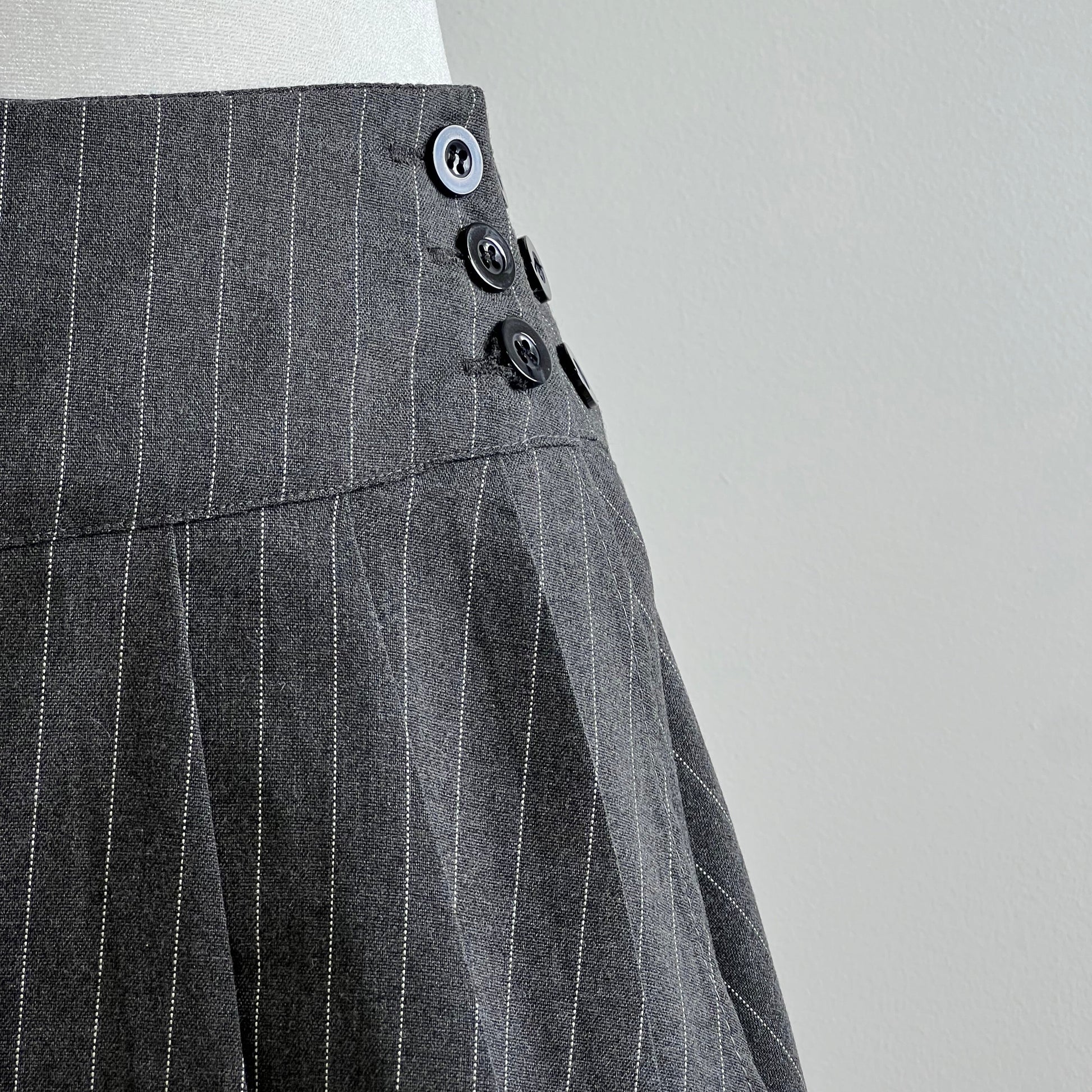 Siren Gray Office Skirt, a structured pleated mini skirt designed for sleek, modern office style. Made from dark gray fabric with subtle vertical pinstripes, it features clean pleats and side-button detailing for a polished, tailored finish. Perfect for pairing with crisp button-downs and loafers for a chic look.