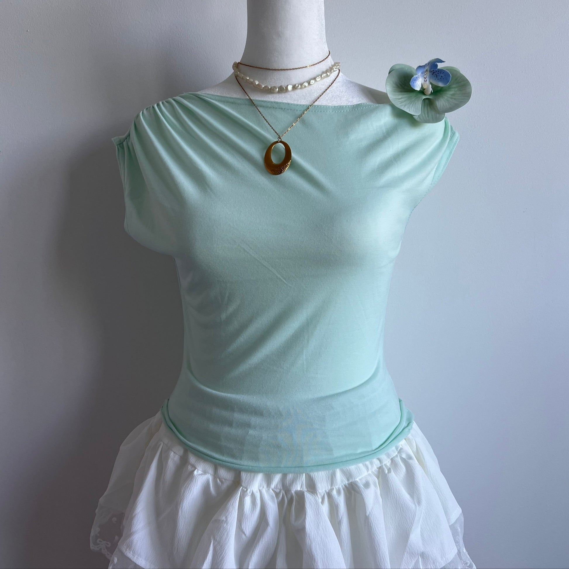 Summer Green Flower Top — a dreamy one-shoulder piece in soft blush green, adorned with a delicate orchid clip for a romantic touch. Feminine and flirty, this top is perfect for date nights, picnics, or breezy afternoons. Pair with a flowing skirt or white trousers for a chic, coastal-inspired look. Model mannequin is wearing size S (US 2-4).